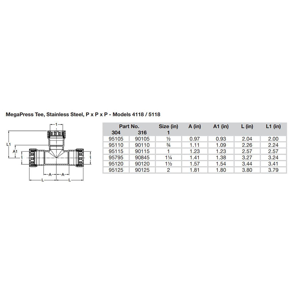 MegaPress 2" Stainless Steel 304 Tee - Triple Press Connection - Smart Connect Technology